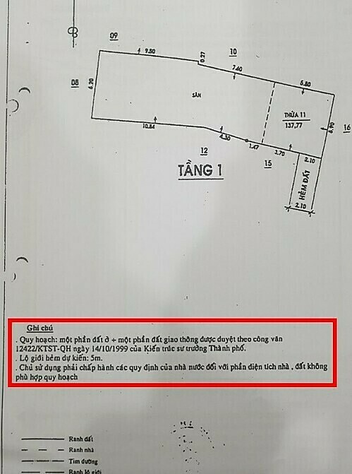 Khi chủ nhà gửi Sổ chủ quyền, anh thấy có hai dòng Ghi chú nho nhỏ ở dưới là “Quy hoạch một phần đất ở và một phần đất giao thông được duyệt,…; lộ giới hẻm dự kiến 5m”.