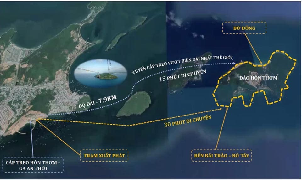 Cáp treo: Khoảng 25 phút từ ga An Thới đến Hòn Thơm