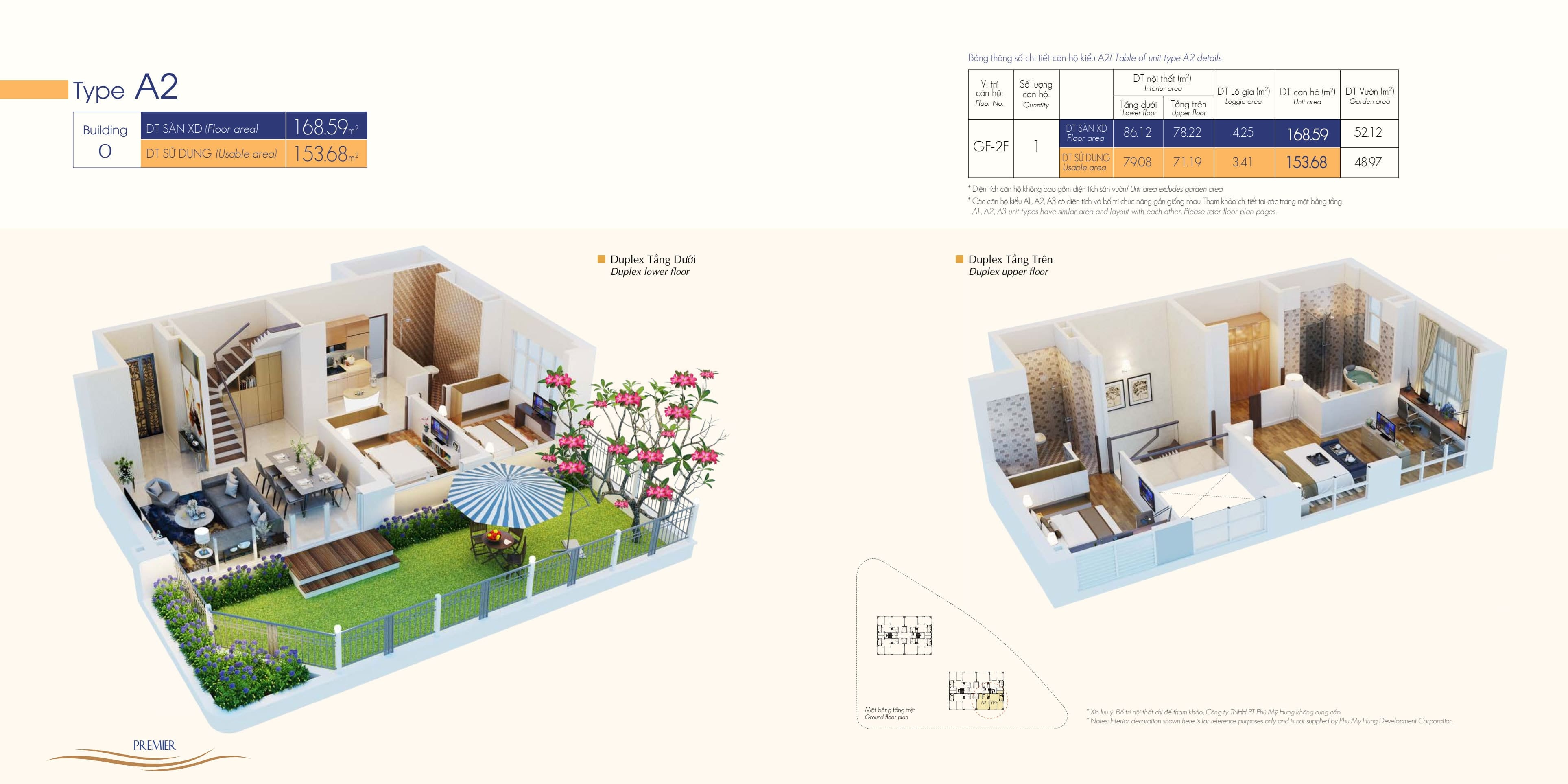 Type A2: 168.59m2 cho diện tích sàn, 153.68m2 cho diện tích sử dụng