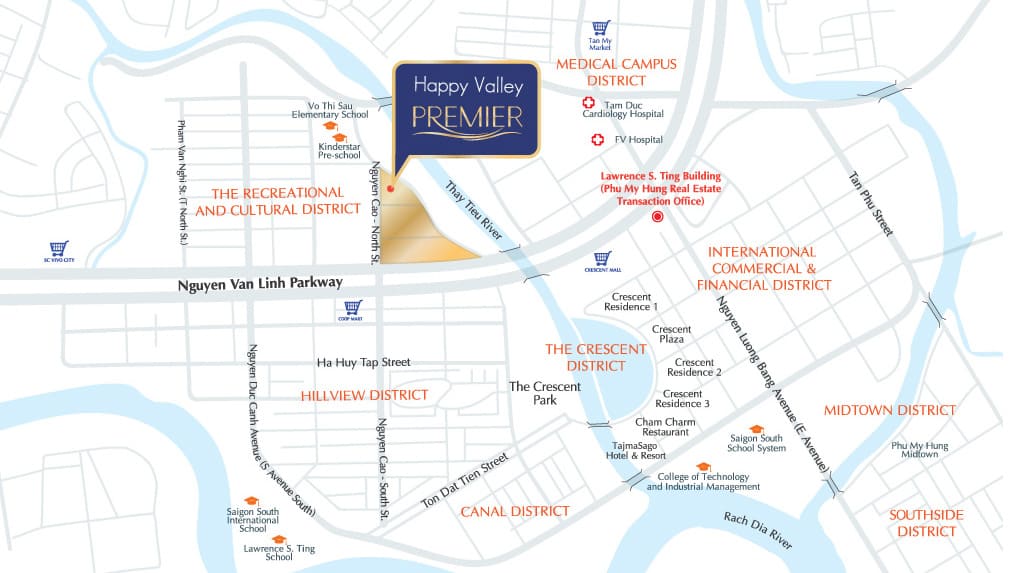 Dự án căn hộ Happy Valley Premier tọa lạc tại số 15 Nguyễn Cao, Tân Phong, Quận 7, Thành phố Hồ Chí Minh, nằm trong khu R12 của dự án Happy Valley. Được bao quanh bởi mảng xanh thoáng mát và cập ven sông Thầy Tiêu, Happy Valley Premier tuy riêng tư nhưng cũng không bị cách biệt bởi các tiện ích hấp dẫn, phù hợp cho nhu cầu sinh sống của rất nhiều cư dân yêu thích không gian yên bình, trong lành giữa thành phố phồn hoa tấp nập.