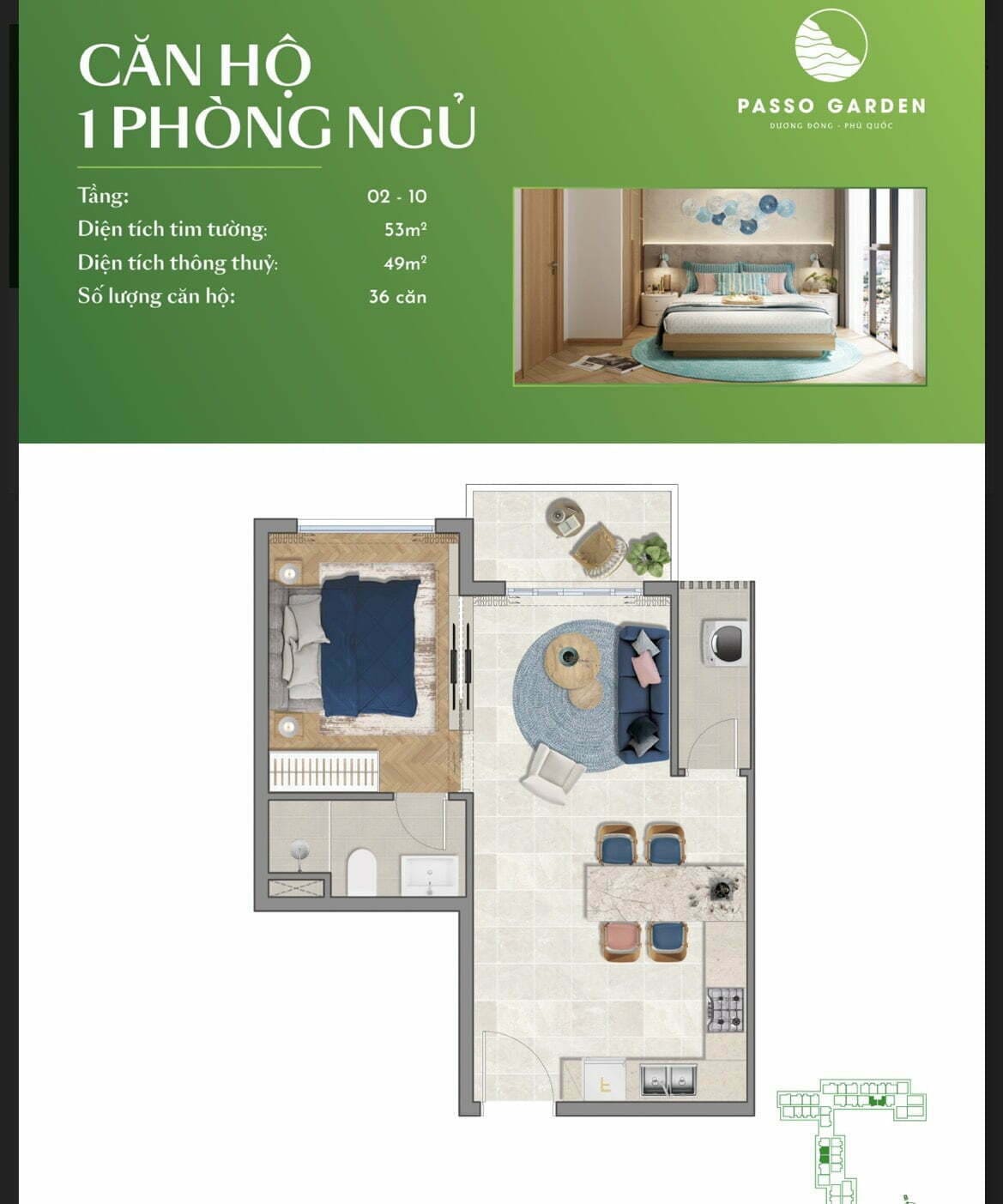 - Thiết kế căn hộ 1 phòng ngủ Passo Garden