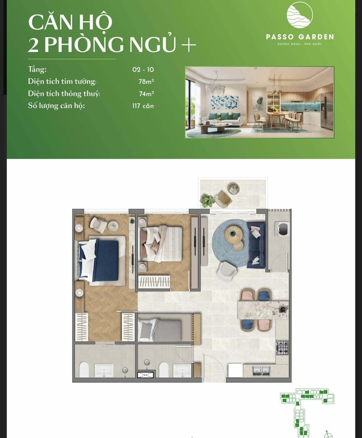 - Thiết kế căn hộ 2 phòng ngủ Passo Garden