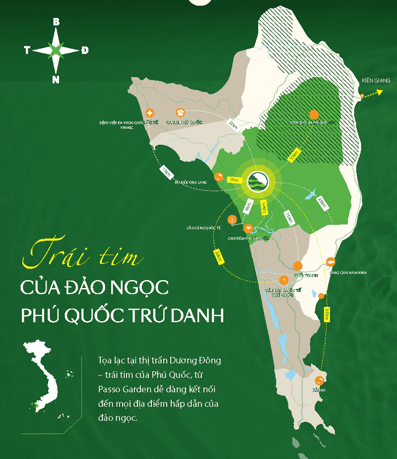 Dự án Passo Garden tọa lạc tại vị trí đắc địa tại Dương Đông – Bãi Thơm, Cửa Dương, Phú Quốc, Kiên Giang. Phú Quốc là một hòn đảo nằm ở phía Tây Nam của Việt Nam, được biết đến như “hòn đảo ngọc” với các bãi biển đẹp và một hệ thống rừng ngập mặn phong phú.