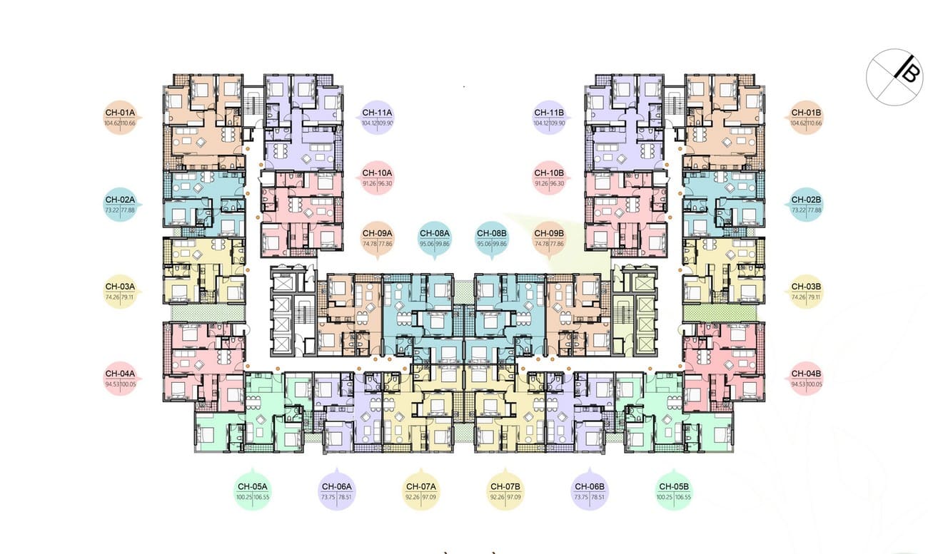 2 phòng ngủ: từ 73m2 đến 74m2