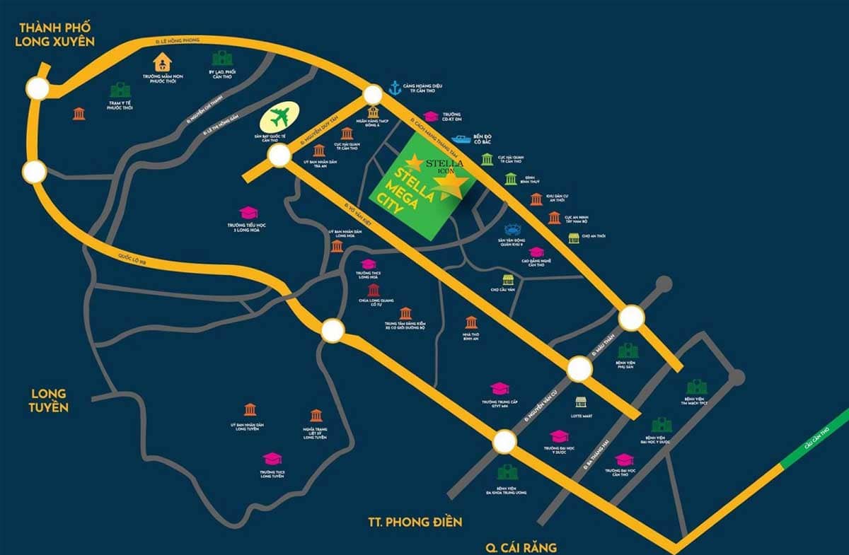 Ngoài ra, dự án còn nằm gần với các tuyến đường giao thông huyết mạch như, QL91, QL91B, Tỉnh lộ 917, 918. Đặc biệt khi Stella Icon nằm gần sông Bình Thủy tạo sự mát mẻ cũng như là mang lại vượng khí cho gia chủ.