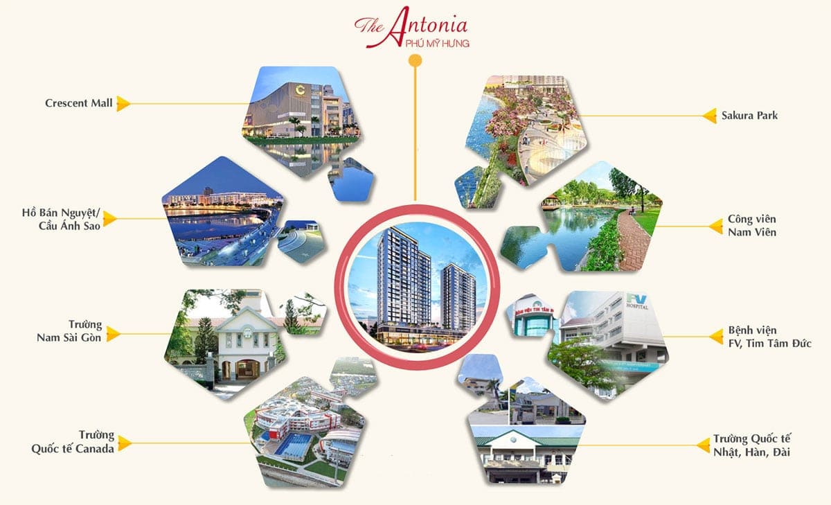 Với vị trí tại trung tâm của Phú Mỹ Hưng, cư dân của The Antonia có thể dễ dàng tiếp cận các tiện ích, dịch vụ và hoạt động giải trí trong khu vực như khu mua sắm, rạp chiếu phim, nhà hàng, quán cà phê và các trung tâm giáo dục, y tế.