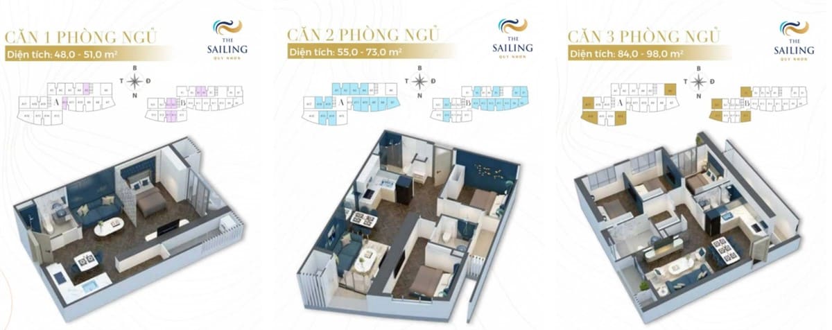 Các căn hộ có diện tích đa dạng từ 50 – 104m2, cơ cấu từ 1 – 3 phòng ngủ, đáp ứng trọn vẹn mọi nhu cầu của khách hàng và nhà đầu tư. Với tiêu chí “Đại dương trong tầm mắt, tiện ích nơi thềm nhà”, The Sailing Bay Resort mang điểm nhấn kiến trúc Neo Classic và hơi thở Địa Trung Hải đầy ấn tượng.