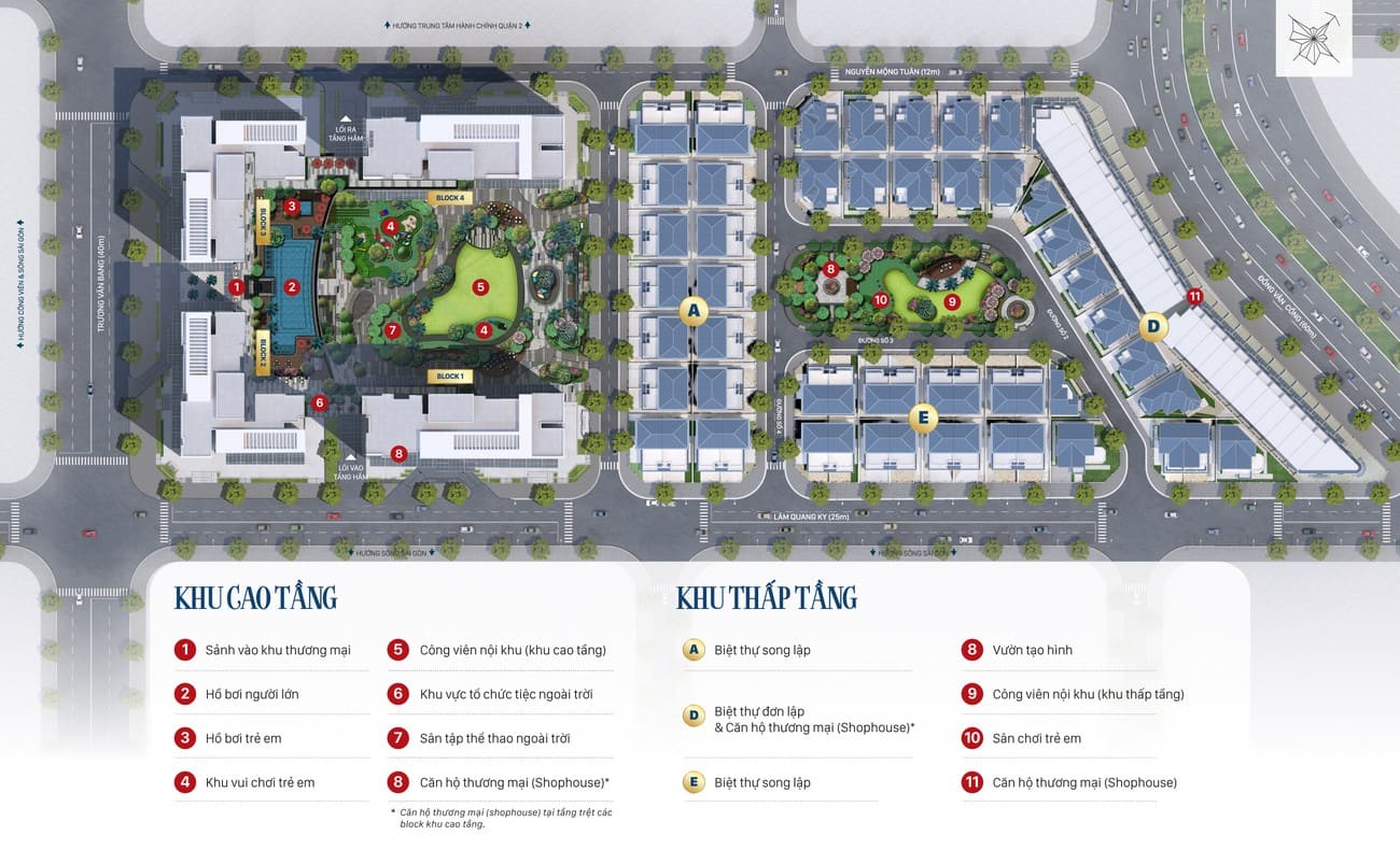 Khu thấp tầng: 2.44 ha (bao gồm nhà phố và biệt thự)
