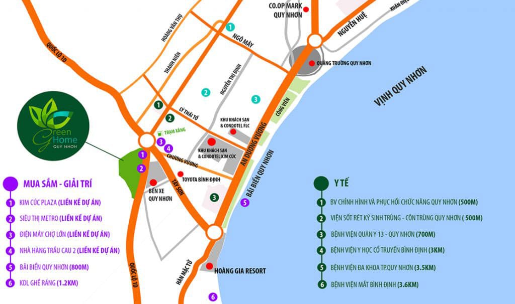 Tọa lạc tại trung tâm thành phố, Green Quy Nhơn dễ dàng tiếp cận các tiện ích công cộng lớn của TP.Quy Nhơn, Bình Định.