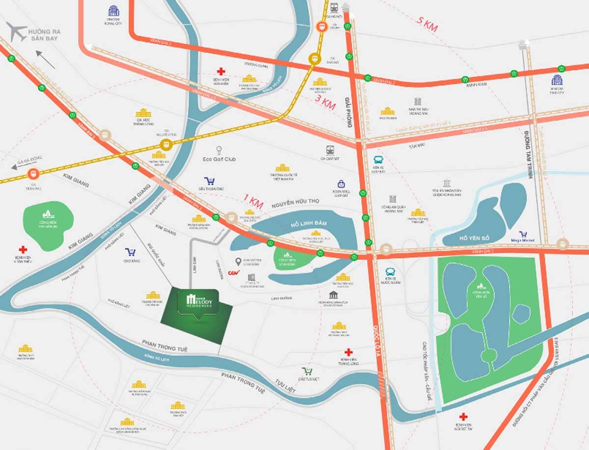 Hanoi Melody Residences nằm tại vị trí trung tâm của khu đô thị Tây Nam Linh Đàm, với 4 lối vào rộng rãi, cư dân dễ dàng kết nối đến các quận Hà Đông, Thanh Xuân, Đống Đa, Hai Bà Trưng và Thanh Trì. Với vị trí thuận lợi này, cư dân có thể di chuyển nhanh chóng đến khu vực phía Nam và trung tâm thành phố thông qua các tuyến đường huyết mạch như Vành Đai 3, Giải Phóng, Quốc lộ 1A. Trong bán kính 3km, cư dân có thể tiếp cận với các tiện ích như hệ thống trường học liên cấp, chợ, siêu thị, tòa văn phòng, chuỗi nhà hàng, quán cà phê, bệnh viện và các trường đại học lớn của Hà Nội.
