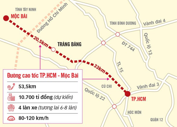Cao tốc TP HCM – Mộc Bài là một trong 8 công trình trọng điểm dự kiến trình HĐND TP HCM thông qua chủ trương đầu tư công trong năm nay. Tuyến đường dài hơn 53 km, điểm đầu giao Vành đai 3 TP HCM, điểm cuối tại Khu kinh tế Mộc Bài (tỉnh Tây Ninh). Đây là tuyến được quy hoạch nhiều năm trước nhưng chưa thực hiện. Tháng 10 năm ngoái, Chính phủ đồng ý cho TP HCM quyết định chủ trương đầu tư và triển khai, phê duyệt dự án. Việc này được chấp thuận sau khi thành phố và Tây Ninh cùng kiến nghị đẩy nhanh thực hiện.