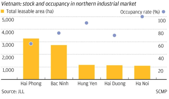 Tỷ lệ lấp đầy trong khu công nghiệp ở khu vực phía bắc Việt Nam, gồm Hà Nội và Hải Phòng, tăng trung bình 72% trong quý đầu tiên từ cuối năm 2019, theo công ty tư vấn JLL. Sự gia tăng của tỷ lệ lấp đầy đến từ nhu cầu cơ bản, trước khi giảm trở lại từ tháng 2/2020 – thời điểm đại dịch bùng phát.